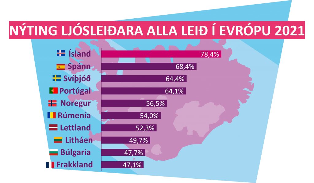 Ísland heldur toppsæti sínu sem það Evrópuland þar sem hæst hlutfall heimila nýtir sér ljósleiðaratengingu til að uppfylla gagnaflutningsþörf heimilisins. Þetta var kynnt á fundi í dag þar sem Fibre to the Home Council Europe kynnti stöðuna í álfunni miðað við september síðastliðinn. Í skýrslunni, sem tekur mið af stöðunni í september 2021, nýttu 78,4% íslenskra heimila sér ljósleiðaratengingu. Í öðru sæti var Spánn með 68,4% nýtingu og í þriðja sæti Svíþjóð með 64,4% nýtingu.
